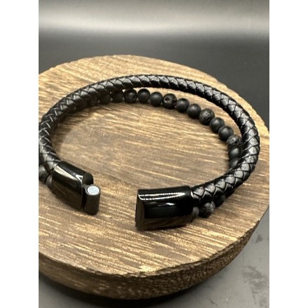Bracelet Homme Cuir & Pierres naturelles cuir noir Pierre de Lave et Shungite